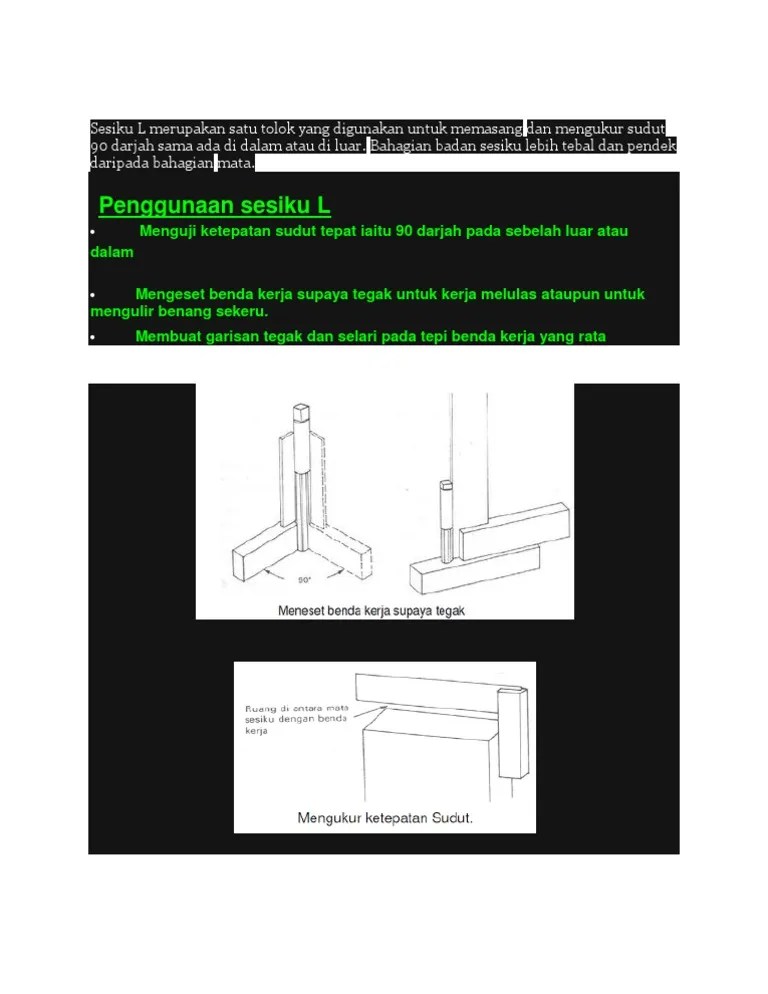 Jenis alatan tangan dan fungsinya. Contextual translation of sesiku l english into english. Sesiku l ialah sejenis alat pengukuran yang digunakan untuk menguji sesuatu permukaan bersudut tepat dan kerataan permukaan kayu, serta menguji kepersegian . Gergaji potong dan sesiku l latest fixed flip ebook pages 1 49 . 1 betul 2018 06 08 tanda bagi fungsi sesiku l yang betul dan x bagi yang.